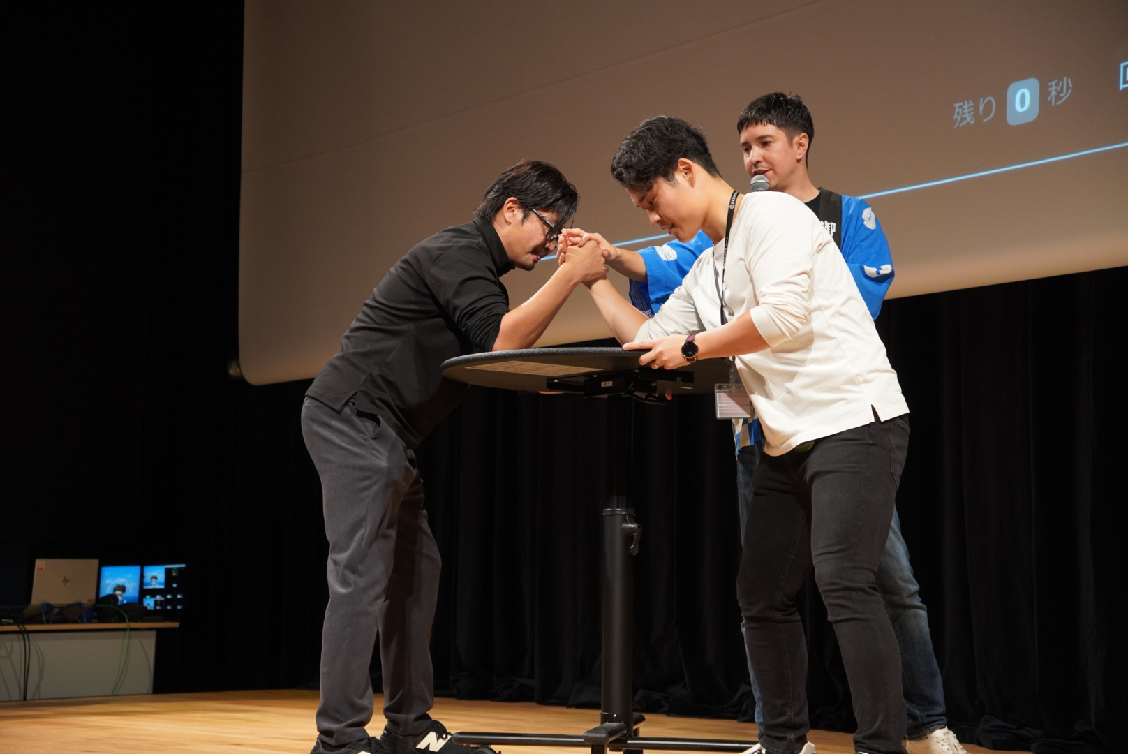 懇親会では、野心組 vs Tech組に分かれて「激苦ドリンクを飲んでいる人はどっち?」「二人羽織りでそばを食べるのが早いのはどっち?」「腕相撲で勝つのはどっち?」など、多岐にわたるバトルを展開。観客は勝敗を予想し投票するゲームで参加し、会場は大盛り上がり。普段見せない社員の一面が見られ、一体感がより深まりました。