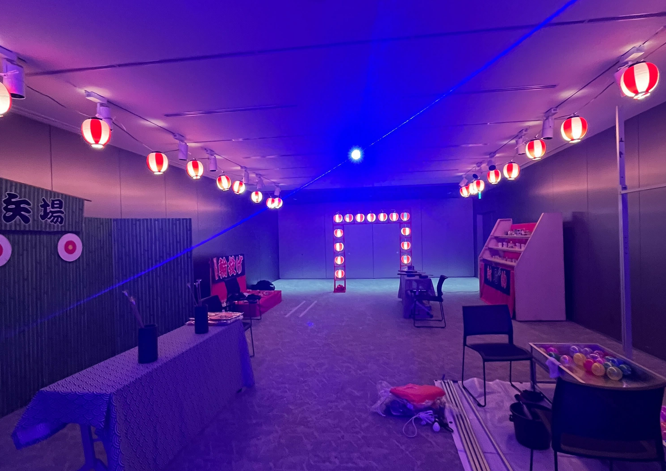 会場は、お祭りの雰囲気を全面的に演出。屋台の出店をはじめ、背景にはお祭りの音や花火の映像が常に流れ、コンセプトを見事に体現しました。