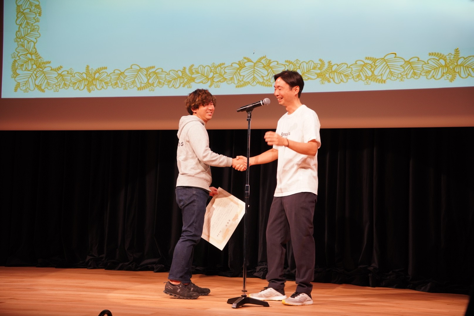 年間最優秀賞を受賞した釜坂さんとCEOの直井さん【懇親会企画:対戦バトル × 勝敗予想投票ゲーム】