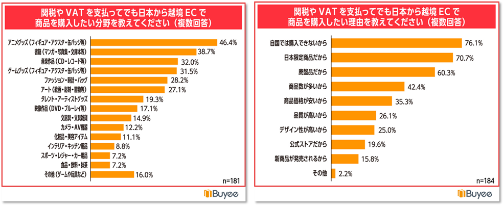 関税やVAT(消費税)を支払ってでも購入したい商品分野は「アニメグッズ」46.4%、「書籍」38.7%、「音楽作品」32.0%とコンテンツ関連が上位に並びました。関税やVATを支払ってでも購入したい理由は「自国で購入できないから」76.1%、「日本限定商品だから」70.7%、「廃盤品だから」60.3%と続きます。本来、自国で購入できれば越境ECを利用する必要性はありませんが、動画視聴サイトなどでコンテンツをきっかけにファンとなった海外の消費者は、商品が豊富な日本から越境ECで購入を行っています。