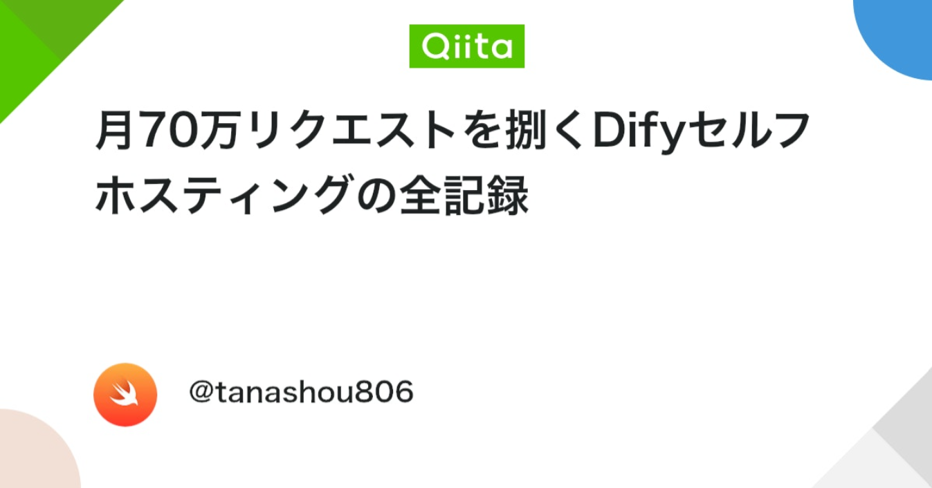 月間70万リクエストを捌くDifyのセルフホスティング運用で直面した、CPU・メモリ・DB接続数・ディスク容量の4つの技術的課題とその実践的な解決策をまとめた記事です。