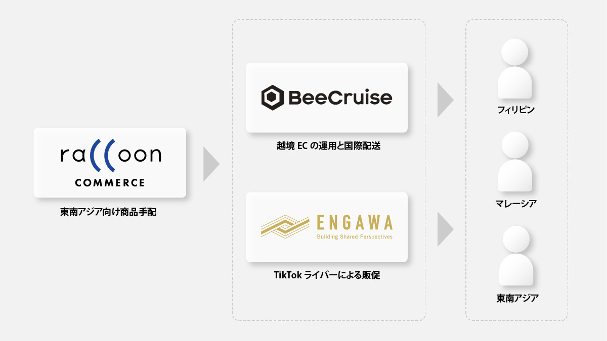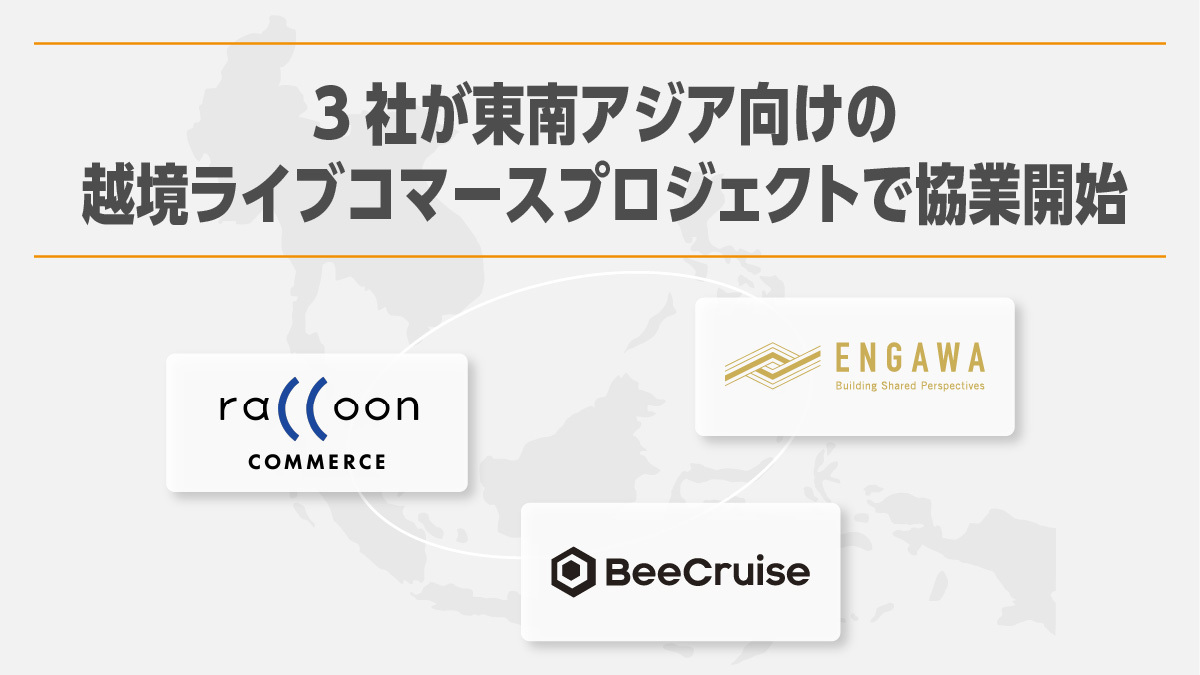 BEENOSグループで、海外マーケットプレイスへの出店支援と新規事業開発を行うBeeCruise株式会社(本社:東京都品川区、代表取締役社長:直井 聖太、以下「BeeCruise」)は、株式会社ラクーンコマース(本社:東京都中央区、代表取締役社長:和久井 岳、以下「ラクーンコマース」)、およびENGAWA株式会社(本社:東京都港区、代表取締役社長:牛山 隆信、以下「ENGAWA」)と共同で、各社の専門性を活かして日本企業の東南アジア市場への展開を目的としたライブコマースプロジェクトを開始いたします。ラクーンコマースが商品の選定を行い、BeeCruiseが越境ECの運営と販売を担当、ENGAWAが越境ライブコマースで販促を実施します。本プロジェクトはフィリピン・マレーシア市場を対象に取り組みを開始し、対象国は順次拡大予定です。